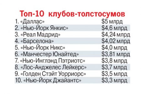 Потерял статус лидера в тусовке финансовых монстров и соккер. До недавнего времени первую строчку всегда занимал кто-то из грандов европейского футбола — «Манчестер Юнайтед» или мадридский «Реал». Но с 2016 года там прочно обосновался «Даллас Ковбойс», клуб NFL (американский футбол). Причем «Ковбои» с 1996 года не выигрывали Супербоул, хотя остаются одними из лидеров по количеству побед — у клуба из Техаса их пять. Интересно и то, что, какой бы звездной и великой нам ни казалась заокеанская НХЛ, ее клубы редкие гости в этом списке.