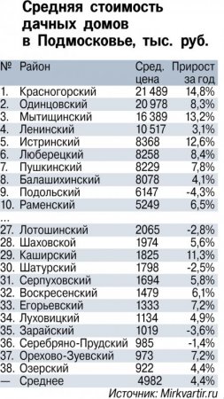 фото: Наталья МущинкинаКак сообщил гендиректор портала «Мир квартир» Павел Луценко, самые дорогие дачи расположены на западе области. Сейчас в ценовые лидеры выбился Красногорский район, где среднюю дачу можно присмотреть приблизительно за 21,5 млн руб. Нижняя же ценовая граница для этого района — около 3 млн. Например, за 3,3 млн руб. можно купить двухэтажный домик из бруса площадью 60 кв. м на 8 сотках земли в Нахабине (17 км от МКАДа).