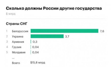Крупнейшим должником является Белоруссия, около $7,55 млрд. На втором месте Украина, дипломатические отношения с которой разорваны. Общая сумма задолженности - $3,7 млрд. По мнению Москвы, Киев должен вернуть $3,075 млрд по еврооблигациям. В свою очередь, украинские власти признают только долг в $0,61 млрд, который образовался в начале 90-х годов.