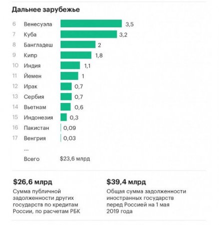В РБК обнаружили по меньшей мере 17 стран, суммарная задолженность которых перед Россией составляет $27 млрд. Крупнейшим должником является Белоруссия, около $7,55 млрд. На втором месте Украина, дипломатические отношения с которой разорваны. Общая сумма задолженности - $3,7 млрд. По мнению Москвы, Киев должен вернуть $3,075 млрд по еврооблигациям. В свою очередь, украинские власти признают только долг в $0,61 млрд, который образовался в начале 90-х годов. Основным должником РФ за пределами постсоветского пространства является Венесуэла. Страна должна вернуть $3,15 до 2027 года. При этом РБК уточняет, что власти РФ традиционно держат в секрете информацию о кредитах, выдаваемых зарубежным странам. По мнению издания, такая непрозрачность объясняется тем, что займы носят не чисто коммерческий, а политический характер, во-вторых, многие займы предоставляются в рамках военно-технического сотрудничества, которое по большей части засекречено. К примеру, Армения, Венесуэла, Индия и Индонезия получали кредиты именно на покупку российских вооружений. Инфографика РБК Александр Шляпников
