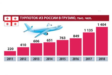 В 2018 году закавказская страна приняла, по данным Национальной администрации туризма Грузии, 6,5 млн туристов, в том числе из России — 1,4 млн. То есть каждый пятый приезжий был из нашей страны. А в мае 2019-го граждане России нанесли свыше 172 тыс. визитов в Грузию, что на 53,2% больше, чем за тот же месяц 2018 года.