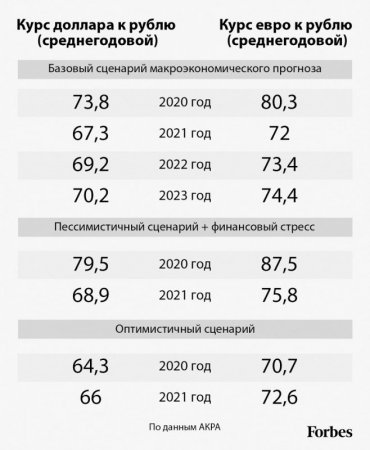 Аналитики АКРА в обновленном макропрогнозе предсказали ослабление рубля. В следующем году, согласно их базовому сценарию, доллар будет стоить 73,8 рубля. Пессимистичный сценарий предполагает, что средний курс доллара в 2020 году составит 79,5 рубля. Рейтинговое агентство АКРА подготовило три макроэкономических сценария для России до 2022 года. Базовый сценарий предполагает, что в 2020 году среднегодовой курс доллара составит 73,8 рубля, а евро — 80,3 рубля. В 2021 году рубль, по этому прогнозу, укрепится (67,3 рубля за $1 и 72 рубля €1), но затем снова начнет слабеть: к 2022 и 2023-м среднегодовой курс доллара будет 69,2 и 70,2 рубля, а евро — 73,4 и 74,4 рубля. Цена нефти Urals, согласно базовому прогнозу, в 2020 году упадет с $60 (прогнозируемая АКРА стоимость на 2019 год) до $53 и приблизится к прежнему уровню только в 2023 году. Согласно оптимистичному сценарию, среднегодовой курс доллара в следующем году составит 64,3 рубля, а евро — 70,7. Баррель Urals подорожает до $66,1. Пессимистичный сценарий АКРА предусматривает, что в 2020 году доллар будет стоить 79,5 рубля, а евро — 87,5, а цена нефти Urals упадет с $57,9 в 2019-м до $40,1 за баррель. Прогнозы на 2022 и 2023 годы в этих сценариях не приводятся. Forbes Курс Цб на 24 июля — 63,1 рубля за $1 и 70,6 рубля за €1. АКРА понизило оценку возможности введения США новых экономических санкций против России с «высокой» (такая оценка давалась в октябре 2018 года, когда ожидались новые санкции по «делу Скрипалей») до «средней», а степень их негативного влияния на российскую экономику — со «средней» до «слабой». Негативное влияние на российскую экономику может иметь снижение темпов роста мировой торговли — вполне вероятно, что временно снизится экспорт традиционных для России товаров, отмечают авторы прогноза. Кроме того, более 20% российского экспорта приходится на прямых участников торговых войн и страны с риском введения протекционистских мер в ближайшем будущем, напоминают они. Согласно базовому прогнозу, к 2020 году экспорт снизится с $401 млрд до $358 млрд, пессимистичному — до $316 млрд, оптимистичному — вырастет до $430 млрд Если шаги с точки зрения регулирования финансовой системы позволят выдержать снижение объемов экспорта без финансового стресса в банковском секторе, то экономика России может пройти неблагоприятный период с темпами роста 0,4–0,9% в 2019 году. Но в случае более значительного падения спроса или «в случае неадекватных мер регулирования» возможно наступление рецессии, предупреждают аналитики. Общий рост неопределенности и «шок физических объемов экспорта» негативно скажутся на инвестиционных планах компаний из разных отраслей, а реализация валютного риска, пусть и ограниченного благодаря бюджетному правилу, сдержит увеличение реальных располагаемых доходов населения и объема потребления, указывает АКРА. Кроме того, на горизонте десяти-двадцати лет страны со средним уровнем доходов на душу населения, включая Россию, будут в меньшей степени способны демонстрировать догоняющий рост. Сближение со странами, имеющими высокий уровень доходов, по таким направлениям, как демографический дивиденд, урбанизация и включение в мировую торговлю, практически достигло своего пика, считает АКРА. •••