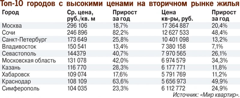 В минувшем году самый большой прирост цены квадратного метра показали квартиры в Сочи (+82,2%) и Краснодаре (+63,6%). «С установлением в этих городах моратория на новое строительство цены на первичном рынке стали неконтролируемо расти, поэтому спрос обратился ко «вторичке», и там тоже начался схожий процесс», — объяснил ситуацию гендиректор портала «Мир квартир» Павел Луценко.