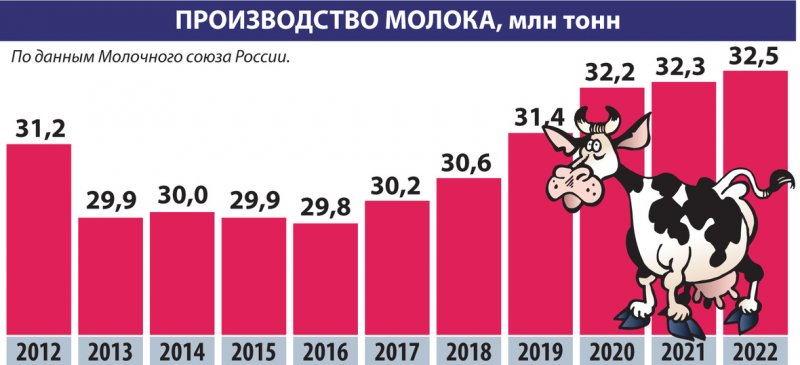 Фото: Иван Скрипалев По словам Маницкой, за последние 2 года в хозяйствах удалось стабилизировать валовое производство молока. В 2020 году в РФ произведено 32,2 млн т, в 2021-м — 32,3 млн т, в 2022-м — около 32,5 млн т. При этом из-за удорожания кормов, дискриминации в энерготарифах, зарегулированности и отсутствия инвестиционной привлекательности общее и дойное поголовье постоянно сокращается. Снижение поголовья частично компенсируется ростом надоев. Если в 2019 году каждая корова в среднем в год давала 6,3 тыс. кг, то в 2021 году — уже 7 тыс. кг.
