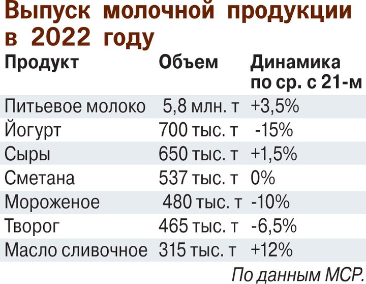 В Молочном союзе заверили, что сыворотки для кисломолочных продуктов хватит всем заводам В последнее время СМИ пугали россиян резким падением выпуска молока и сметаны из-за острого дефицита закваски. Как оказалось, опасения не имеют под собой никаких оснований. «Слухи о возможном дефиците сметаны и сыров в магазинах сильно преувеличены», — заявила «МК» на ежегодном съезде, прошедшем в рамках выставки «Продэкспо-2023» в Москве, глава Молочного союза России Людмила Маницкая. Фото: Наталья Мущинкина Как пояснила Маницкая, в советское время два завода, в Барнауле и Угличе, полностью обеспечивали потребности молокозаводов в «живой» закваске. После распада СССР объемы выпуска продукции сильно упали из-за сужения рынка сбыта. К тому же импортеры, пользуясь удобным моментом, резко нарастили поставки более дешевой порошковой закваски. И даже если они уйдут с российского рынка, запасов закваски для производства сыров и сметаны у нас хватит. Как выяснил в кулуарах форума «МК», панику в своих интересах раздувал один крупный бизнесмен, пожелавший с помощью государственной поддержки построить новый завод по выпуску заквасок. Так что можно расслабиться, полюбившиеся сорта сметаны и сыра никуда с магазинных полок не денутся. Гораздо больше производителей и переработчиков молока волнуют другие угрозы. Так, в прошлом году молочную индустрию лихорадило из-за проблем с упаковкой. Некоторые производители вынуждены были перейти на розлив продукции в ПЭТ-бутылки. Правда, большинство потом вернулось к привычной таре. Фото: Иван Скрипалев По словам Маницкой, за последние 2 года в хозяйствах удалось стабилизировать валовое производство молока. В 2020 году в РФ произведено 32,2 млн т, в 2021-м — 32,3 млн т, в 2022-м — около 32,5 млн т. При этом из-за удорожания кормов, дискриминации в энерготарифах, зарегулированности и отсутствия инвестиционной привлекательности общее и дойное поголовье постоянно сокращается. Снижение поголовья частично компенсируется ростом надоев. Если в 2019 году каждая корова в среднем в год давала 6,3 тыс. кг, то в 2021 году — уже 7 тыс. кг. В прошлом году сильнее всего сократился выпуск йогуртов (см. таблицу). Из экспортных товаров из-за санкций больше всего пострадали производители мороженого. Заметнее всего поставки этого лакомства упали в США. Участников молочного рынка также беспокоит опустынивание земель сельхозназначения и массовый исход селян в города. «В начале XX века в сельской местности проживало 87% населения России. Сейчас в деревнях осталось лишь 26% жителей страны. Из-за низких зарплат и плохого инвестклимата селяне снимаются с насиженных мест. За последние 20 лет исчезло 23 тыс. деревень. Это значит, каждый день умирает три деревни», — сообщила Маницкая. С ее слов, на земли без народа придут народы без земли. Они не придут работать за нас, они придут вместо нас — работать и жить. Еще одна острая проблема отрасли — технологическое отставание. «В российской молочной индустрии доля импортного оборудования и технологий составляет 80–90%», — отметил председатель Комитета ТПП РФ по развитию АПК Петр Чекмарев. По его мнению, помимо субсидий на модернизацию молзаводов и ферм требуются новые меры поддержки отечественных производителей. Член Комитета по аграрным вопросам Госдумы Сергей Лисовский предложил правительству, коллегам из ГД и 
