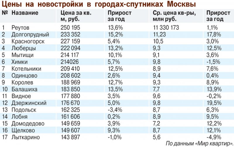 По расчетам гендиректора портала «Мир квартир» Павла Луценко, с февраля 2023 г. по февраль 2024 г. в городах-спутниках Москвы в среднем 1 квадратный метр подорожал на 7%, а средний лот — на 6,3%. Сейчас при российской столице самые дорогие города-спутники — это Реутов, где метр новостроек стоит 250 195 руб., а квартира целиком — 11,3 млн руб. (см. таблицу), Долгопрудный (233 352 руб./кв. м и 11,2 млн) и Красногорск (227 159 руб./кв. м и 10,5 млн).