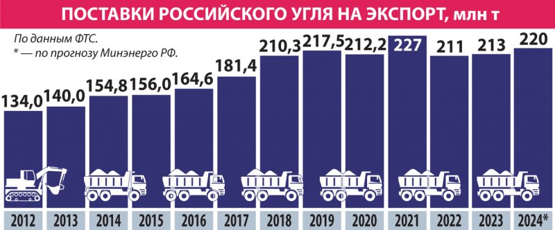 По прогнозу Чернова, в 2024 году российские производители угля сократят экспорт на 10-12,5 млн т, до 200-202,5 млн т. Но по итогам 2026 года после расширения пропускной способности Восточного полигона он ожидает от них новых рекордов в объемах добычи и экспорта угля в районе 227 млн т.