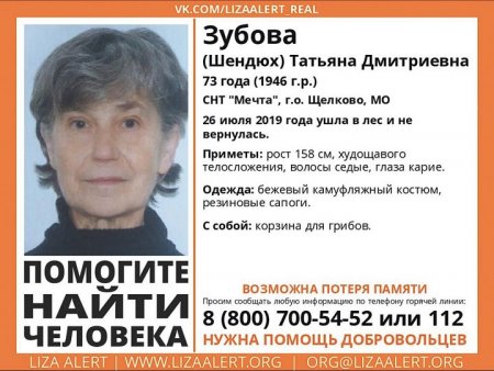 Одна из них — 73-летняя Татьяна Дмитриевна Зубова. 26 июля рано утром, в 4.37 (время зафиксировала камера видеонаблюдения), она с корзиной в руках отправилась из СНТ «Мечта» Щелковского района в ближайший лес за грибами. Больше ее никто не видел.