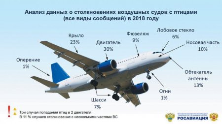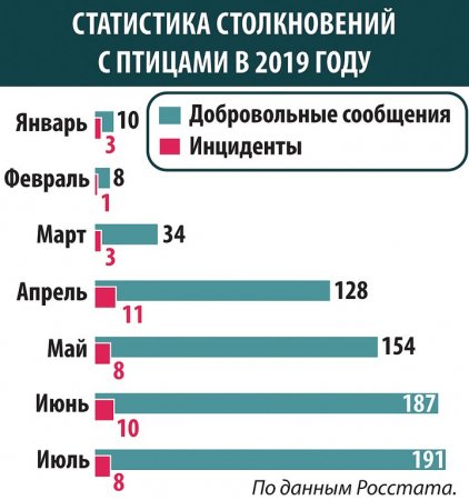 Самыми опасными в плане орнитологического риска, согласно статистике, являются два летних месяца- июнь и июль. Так, в этом году в июле был зафиксирован 191 случай столкновения с птицами (8 из них привели к серьезным инцидентам). Больше всего столкновений происходит в дневное время суток, в 30% всех случаев, зафиксированных в России, виновны именно чайки. Чаще всего пернатые залетают в турбины самолетов (30%), крылья (23%) и носовую часть (13%).