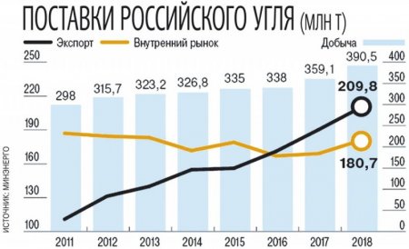 По данным Института проблем естественных монополий, за последние два десятилетия добыча угля в РФ постепенно увеличивалась, и к 2018 году достигла 440 млн тонн. При этом объемы экспорта составили рекордные 200 млн тонн, что в 4,8 раза больше, чем в начале XXI века. В стоимостном выражении экспорт также значительно вырос. Особенно это было заметно в течение последних двух лет. Как результат, доля угля в общем объеме российского экспорта достигла 3,8%.