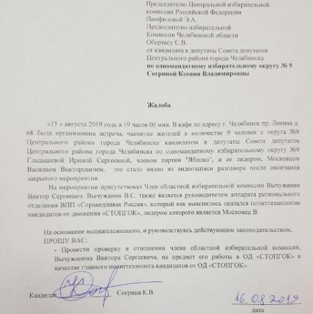 Члена облизбиркома от «Справедливой России» Виктора Вычужанина обвинили в помощи кандидатам от «Яблока» Василию Московцу и Ирине Гладышевой на выборах в Центральный райсовет Челябинска. Жалоба направлена председателю Центризбиркома РФ Элле Памфиловой и главе региональной комиссии Сергею Обертасу. В жалобе говорится, что 15 августа несколько жителей района, Московец и Гладышева встречались с Вычужанином в кафе по проспекту Ленина.«Прошу провести проверку в отношении Вычужанина на предмет его работы в общественном движении «СТОПГОК» в качестве главного политтехнолога кандидатов от «СТОПГОК», лидером которого является Московец», — просит автор жалобы, кандидат-самовыдвиженец Ксения Согрина.
