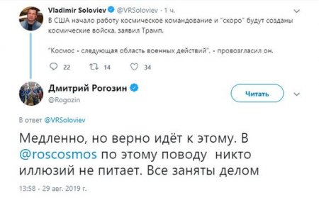 Глава "Роскосмоса" Дмитрий Рогозин прокомментировал слова американского лидера Дональда Трампа, который заявил, что космос станет новой областью ведения боевых действий. По словам Рогозина, Трамп прав, все к этому и идет.