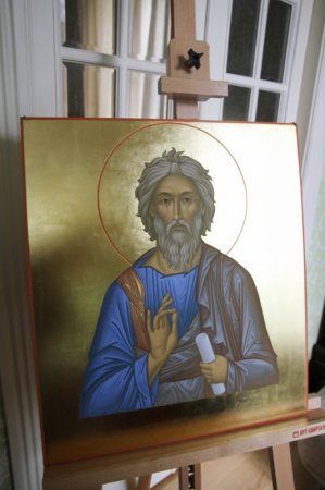 Готовые иконы показали в мастерской художника Михаила Леонтьева. Это образ святого пророка Илии - небесного покровителя Воздушно-космических сил и Воздушно-десантных войск, а также святого апостола Андрея Первозванного – небесного покровителя российского Военно-морского флота. Как известно, не случайно флаг ВМФ иначе еще называют Андреевским.