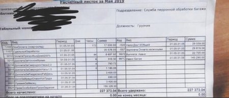Перед нами — зарплатный квиток одного из сотрудников подразделения «Служба перронной обработки багажа». Оплата по окладу: 17 тысяч, сдельный заработок — 35 тысяч. Дальше идут доплаты по мелочи — за переработку в ночное время, выходные дни, опасные условия труда. Но самый большой бонус — это последний пункт, в самом низу: «Премия за особо важное производственное задание» — за это рядовой грузчик получил только в мае свыше 150 тысяч рублей. Итого: общая сумма выплат составила без малого 230 тысяч рублей.
