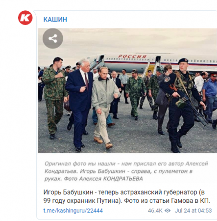 скриншот По его словам, фотография относится к событиям августа 1999 года, когда премьер-министр Путин прибыл в село Ботлих Ботлихского района Дагестана. Именно с вторжения боевиков в этот район началась вторая чеченская кампания. Бабушкин рассказал, что он прилетел туда в составе передовой группы. Он добавил, что этот кадр ему очень дорог, и пообещал повесить эту фотографию в своем кабинете. Игорь Бабушкин стал врио губернатора Астраханской области в июне текущего года, до этого в течение девяти месяцев был заместителем полпреда президента в Северо-Кавказском федеральном округе. В полпредство перешел из Федерального агентства по управлению госимуществом, где работал с января 2013-го. Его военная карьера длилась с 1992-го по 2012 год: он служил в Вооруженных силах и подразделениях ФСБ. Имеет звание полковника, награжден Орденом Мужества. В последние годы в России руководителями нескольких регионов были назначены бывшие сотрудники охраны Владимира Путина. Это выходцы из Федеральной службы охраны Алексей Дюмин (ныне губернатор Тульской области), Дмитрий Миронов (глава Ярославской области), Евгений Зиничев (был врио губернатора Калининградской области, сейчас — глава МЧС России) и Сергей Морозов, руководивший Астраханской областью до назначения Бабушкина. •••