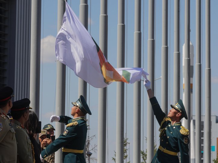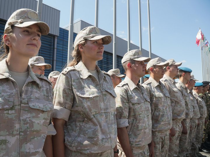 Генерал-полковник подошел к построившимся на плацу командам из России, Азербайджана, Армении, Белоруссии, Китая, Мали, Зимбабве, Венесуэлы.