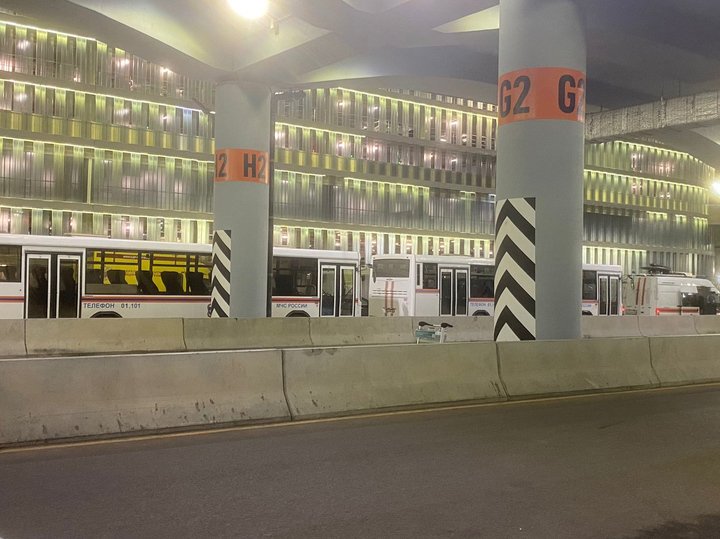 Фото: Ирина Боброва Около выхода из аэропорта стоят два автобуса МЧС и четыре машины скорой помощи.