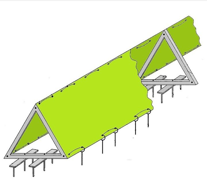 По сути, ограждающие элементы представляют собой палатки. Каркасом служат равнобедренные треугольники из металла, в трех углах которых просверлены отверстия для тросов. Они устанавливаются на расстоянии 1,5-2 метра один от другого. К основаниям треугольников крепятся металлические пластины с почвозацепами — приваренными к ним штырями длиной около 15 сантиметров. Длина ребер треугольника — 1 метр, углы при основании 75°. Опытным путем ученые-пожарные установили, что этого достаточно.