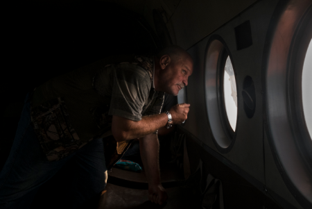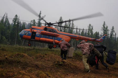 Сергей Строителев Я быстро оделся и собрал все необходимое в рюкзак — объявили вылет. Мы прыгнули в уазик, который направился на вертолетную площадку на берегу Ангары. Путь предстоял часовой — меня решили перекинуть на пожар в 100 километрах от Богучан. Мы летели над горящей тайгой. Дым висел в воздухе плотным слоем, скрывая все на многие сотни метров. Такое ощущение, что облака опустились на землю. Красиво и страшно. Ребята открыли иллюминаторы, ловили потоки воздуха руками, грызли семечки и смеялись, а потом подолгу смотрели на плывущую землю — им предстояла командировка, возможно, длительная и опасная. Вертолет два раза садился. Каждый раз под ревущими лопастями ждали люди и каждый раз выгрузка длилась секунды: несколько человек половчее забегают в вертолет, из рук в руки летают тюки, пакеты, баулы, набитые долгожданным провиантом. На багаж ложатся всем телом — чтобы не собирать его потом по округе. Я крепко держал рацию, которую мне выдали, чтобы никто по ошибке не отдал ее.«Это единственный источник связи, без нее не вылетишь назад».