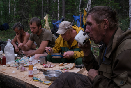 Молодые парни пытаются выглядеть уверенно, но в их глазах я вижу страх: для некоторых это вторые, третьи сезоны. Они делают крайние звонки родным — в тайге не будет связи. Худенький парень пихает палатку в чехол, сам чуть ли не целиком проваливаясь внутрь. Белая собака Лиза бегает вокруг палаток, осматривает тюки и грустно заглядывает ребятам в глаза. •••