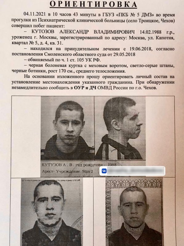 Александра Кутузова ищут четвертые сутки Пятые сутки ведутся поиски 33-летнего Александра Кутузова, сбежавшего из психиатрической больницы специализированного типа в селе Троицкое Чеховского района Подмосковья. Увы! Опасный беглец, а Кутузов когда-то совершил убийство, как сквозь землю провалился. Спецкор «МК» в качестве члена Общественной наблюдательной комиссии Московской области посетил психиатрическую больницу, чтобы выяснить обстоятельства громкого дела. На эту будку и прыгнул Александр Кутузов Вчера появилась информация, что мужчину все-таки поймали в 30 км от родной больницы под Подольском. Однако вскоре эти сведения были официально опровергнуты. Что же стало причиной побега? Ссора ли с охраной медучреждения, как об этом написали СМИ, невыносимые условия существования, или решение удрать было случайным, сиюминутным, под настроение? Этот год для Подмосковья оказался богат на побеги из мест принудительного лишения свободы, которыми считаются не только изоляторы и исправительные колонии, но и психиатрические больницы. В августе из ИВС в Истре сбежали пятеро заключённых, среди них киллер Александр Мавриди, подозреваемый в убийстве колбасного короля, миллиардера Владимира Маругова. Четверо были вскоре пойманы, один сдался сам. При общении с правозащитниками все беглецы, кроме Мавриди, искренне раскаивались в том, что совершили. Возможно потому, что с самого начала было понятно: рано или поздно всех поймают. Куда, собственно говоря, бежать, как выжить и начать новую жизнь, когда в больших городах камеры на каждом шагу, а до маленьких населенных пунктов ещё надо как-то добраться? Поэтому побег Александра Кутузова, который провёл за решеткой психбольницы долгих 15 лет, на первый взгляд кажется тоже бессмысленным. Без денег, мобильного телефона, документов, друзей, долго на воле не продержаться. Особенно поздней осенью. Кутузов сбежал 4 ноября утром во время прогулки по внутреннему дворику. Он неожиданно вскарабкался по сетке-рабице, оттуда ловко перепрыгнул на будку охранника, взлез на бетонный забор и прыгнул вниз — на другую сторону, с четырёх метров. «Некоторым ребятам даже показалось, что он сальто в воздухе сделал, так быстро все это случилось», — рассказал один из пациентов. Больнице в Троицком в следующем сентябре исполнится 115 лет. Она относится к Москве, но находится на территории Московской области, поэтому проверяют ее именно подмосковные правозащитники. Сюда помещают преступников, направленных на лечение по решению суда, поэтому для жителей села подобное соседство вполне привычно. Основательное здание из красного кирпича за высоким четырёхметровым забором, который перепрыгнул Александр Кутузов — это и есть главная местная достопримечательность. Кроме психиатрической больницы, никаких особых объектов в Троицком больше нет. Пара сетевых супермаркетов, церковь, пустой поселковый рыночек, выглядящий особенно мрачно в эпоху локдауна. Открыта только палатка с горячими пирожками. Весь периметр вокруг рынка и больницы просматривается на раз. А сразу за околицей начинается лес, редкие садовые товарищества, единственная петляющая дорога на Москву, местами переходящая в одноколейку. Если и есть возможность спрятаться, так только на дачах. Но это надо заранее предусмотреть, все просчитать. Способен ли на это д