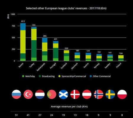 По мнению Deloitte, Российская премьер-лига по объему доходов уступает только "большой пятерке" европейских чемпионатов: Англии (5440 млн евро в год), Германии (3168 млн евро), Испании (3973 млн евро), Италии (2217 млн евро) и Франции 1692 млн евро).
