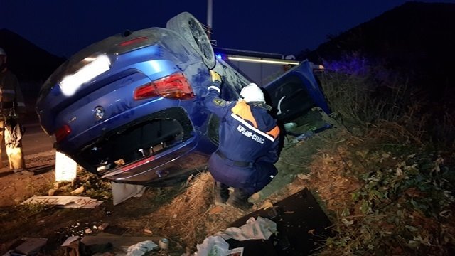 «Водитель легкового автомобиля ВMW, житель Краснодара, не справился с управлением и съехал в кювет, допустив опрокидывание транспортного средства. При помощи шанцевого инструмента спасатели деблокировали пострадавшего из машины и передали его сотрудникам «скорой помощи» для дальнейшей госпитализации», – говорится в сообщении.