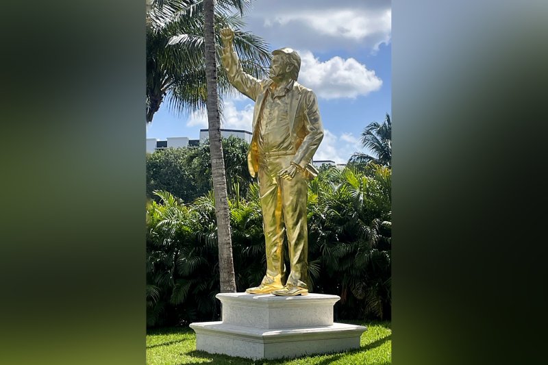 Статуя из золота Трамп разместил свою золотую статую на гольф-курорте Trump National Doral. Высота монумента - 4,5 метра, а с пьедесталом - почти 7 метров. Сделана статуя из позолоченной бронзы. Трамп предстает в известной позе - с поднятой рукой и сжатым кулаком. Таким он запомнился после покушения летом 2024 года.